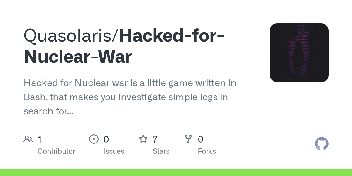 arrow-up126arrow-down1external-linkHacked for Nuclear War: A small Bash game about a cyber attack inside a submarineplus-squaregithub.comcm0002@lemdro.idEnglish · 1 day agomessage-square0fedilink