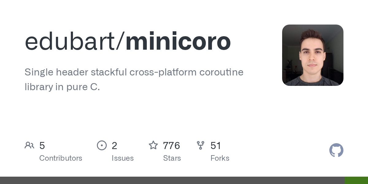 arrow-up11arrow-down1external-linkminicoro: Single header stackful cross-platform coroutine library in pure Cplus-squaregithub.comRSS BotMBEnglish · 10 hours agomessage-square0fedilink