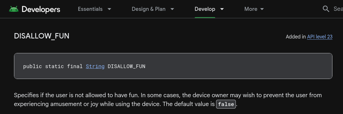 Previously I have covered a relatively obscure now-removed placeholder string in Android that doubles as an easter egg, the fictitious carrier by the name of El Telco Loco. But this time it is about methods and other parts of the publicly facing Android API that may generally be more humourous than they are useful. Easter eggs, jokes, whatever you want to call them, that are visible to Android app developers rather than regular users.