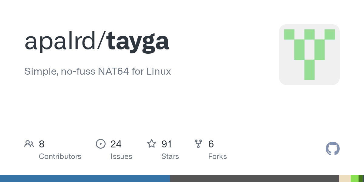 RSS BotMB to Lobste.rsEnglish · 5 months agotayga: Simple, no-fuss NAT64 for Linuxgithub.comexternal-linkmessage-square0fedilinkarrow-up12arrow-down10file-textcross-posted to: opensource@programming.devtechnology@lemmy.world