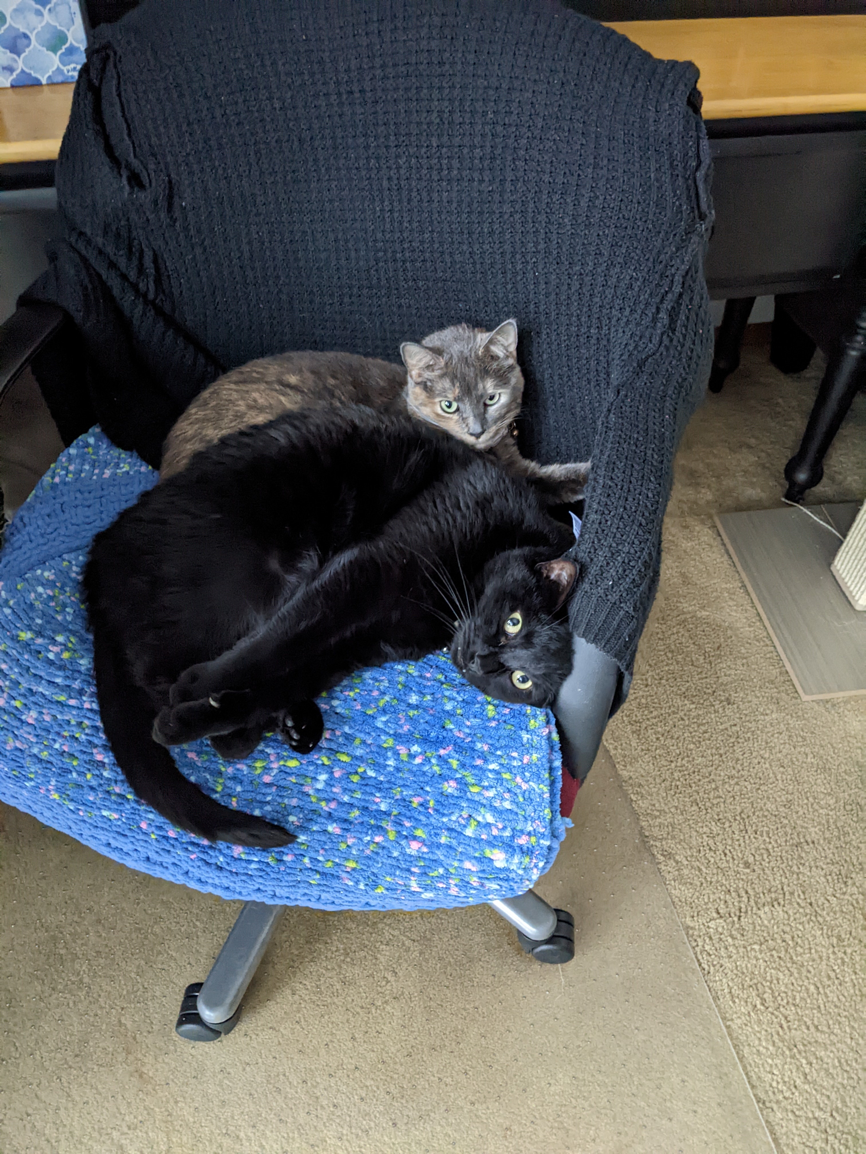 Sometimes I call them salt and pepper. They are a funny pair, though they are rarely this affectionate anymore. Henry is more than twice her size, but she’s the one always starting shit for some reason.