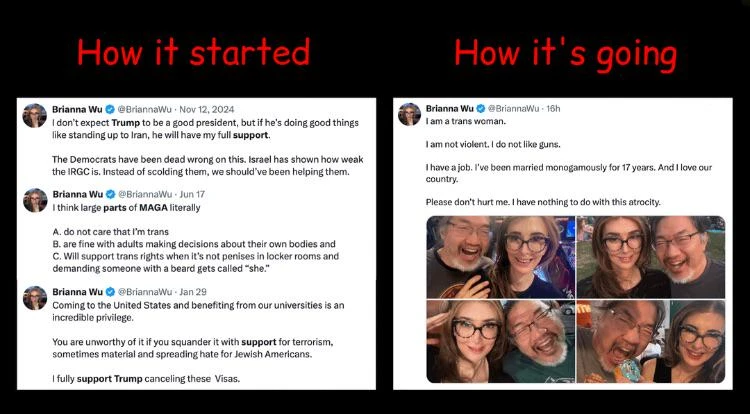 Oh shit, he’s coming for me now. Who could’ve foreseen this!!!?!!”I’ve gone from being super far rightwing to now being super far leftwing over the course of my life; yet somehow, “Brianna Wu is a fucking idiot” has remained constant.