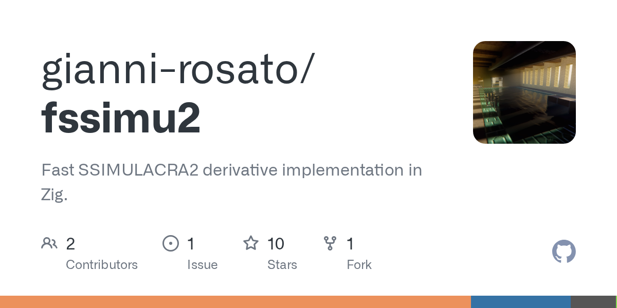 arrow-up11arrow-down1external-linkfssimu2: Fast SSIMULACRA2 implementation in Ziggithub.comRSS BotMB to Lobste.rsEnglish · 4 hours agomessage-square0fedilinkfile-text