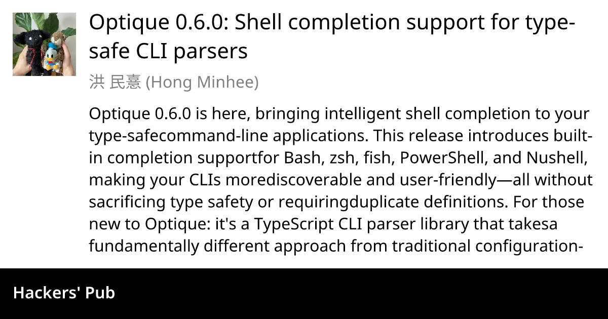 Optique 0.6.0 introduces intelligent shell completion to type-safe command-line applications, supporting Bash, zsh, fish, PowerShell, and Nushell. Unlike traditional CLI frameworks, Optique leverages the same parser structure for both argument parsing and completion, eliminating duplicate definitions and ensuring synchronization. Setting up completion is straightforward, with users generating and sourcing a completion script for their shell. The system works automatically with all Optique parser types, offering context-aware suggestions, including file system completion and custom logic for domain-specific value parsers. Additionally, the release enhances command documentation with separate brief, description, and footer texts, and introduces a `commandLine()` message term for clearer command-line examples in help text. Existing Optique users can easily migrate by adding a `completion` option to their `run()` configuration. This release aims to make Optique-based CLIs more user-friendly without sacrificing type safety and composability, providing sophisticated runtime features while maintaining compile-time guarantees.