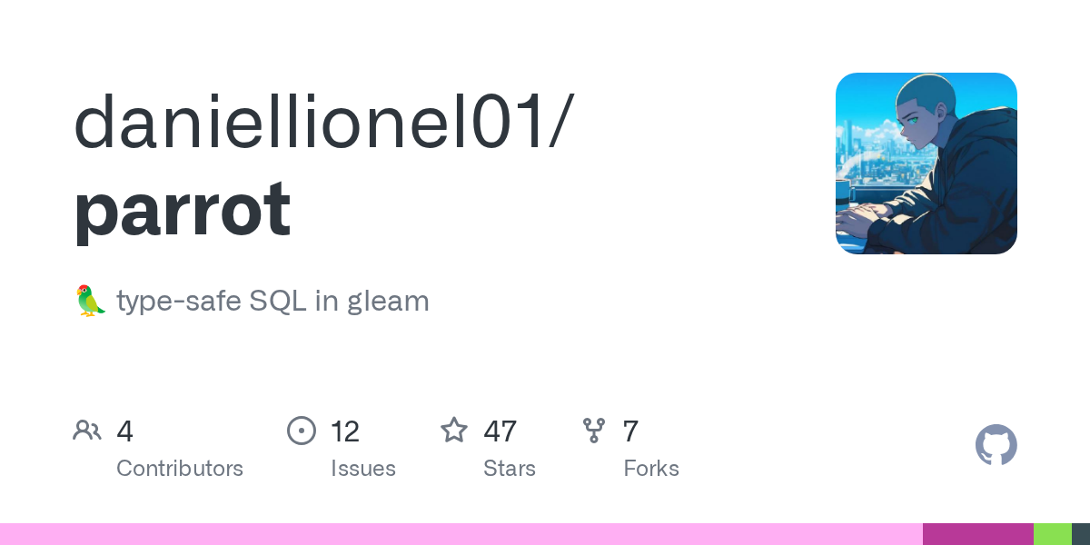 arrow-up13arrow-down1external-linkParrot – type-safe SQL in Gleam, supports SQlite, PostgreSQL and MySQLgithub.comRSS BotMB to Hacker NewsEnglish · 3 hours agomessage-square0fedilinkfile-text