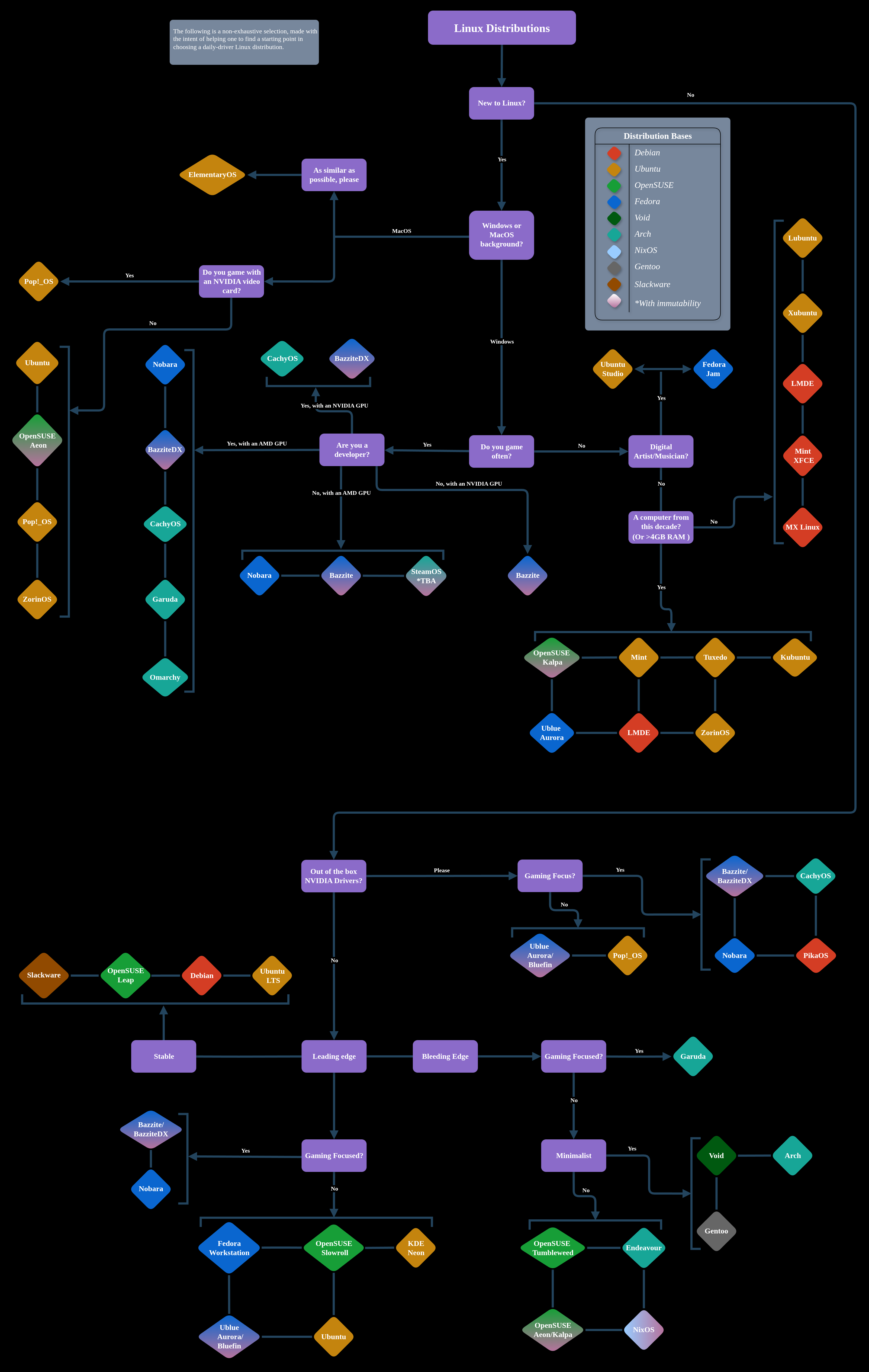 When I first began researching Linux, for my needs, I found the number of different Distros to be overwhelming. So I made this flow chart, with the intent to help new users find a starting point for choosing a distribution.