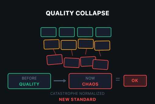 The quality was always questionable in IT because of how projects are being managed. That’s why you have consulting companies. The only difference you get from AI is companies trying to lower the wages and reduce costs to share profit with AI companies. Those tools bring no more value than hiring more junior / bootcamp level developers. The difference is from junior developer you can in a year or two get full team member but from AI you will get constraint amount of slop because it doesn’t evolve.