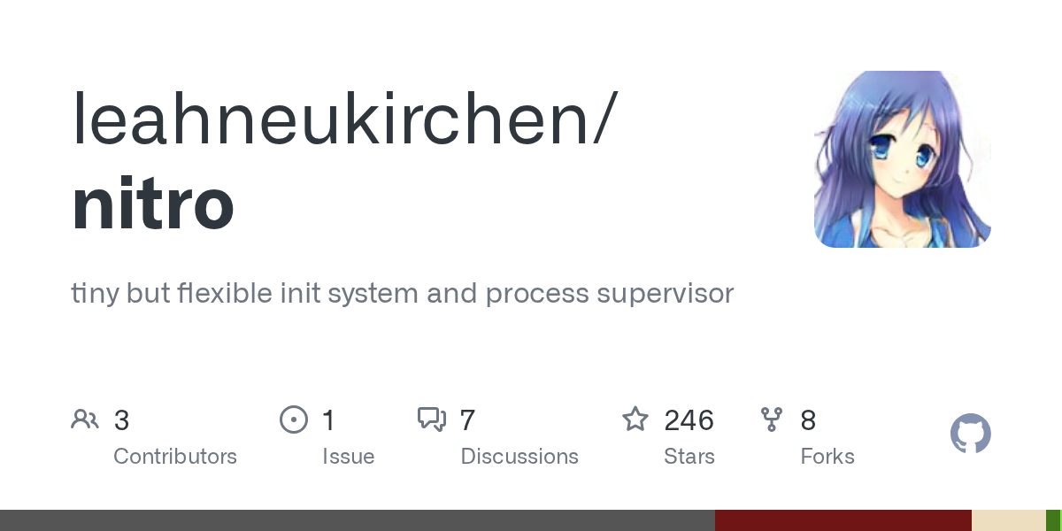 arrow-up11arrow-down1external-linknitro: tiny but flexible init system and process supervisorgithub.comRSS BotMB to Lobste.rsEnglish · 2 hours agomessage-square0fedilinkfile-textcross-posted to: linux@programming.devTechnology@programming.dev
