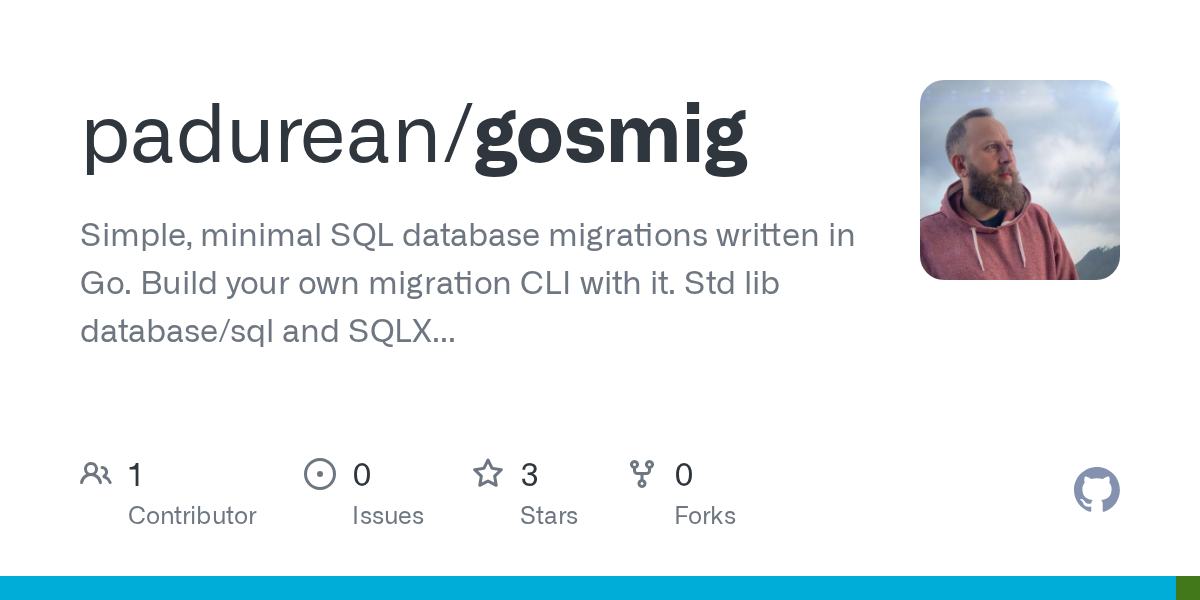 I built GoSMig for personal projects and open-sourced it. It’s a tiny library for writing migrations in Go (compile-time checks via generics). Supports both transactional and non-transactional steps, rollback, status/version commands, and a built-in CLI handler so you can ship your own tool.