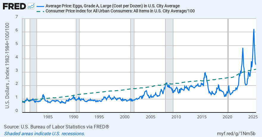 Egg prices vs. Consumer Price Index since 1980