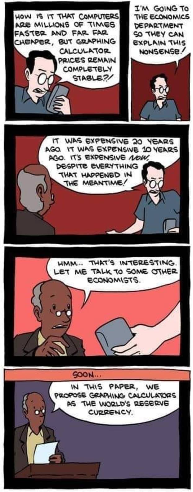 You only need a graphing calculator because you’re not allowed to use wolfram alpha, desmos, or Matlab. Since you’re mandated to use graphing calculators, (sometimes even specific models) there’s no incentive to make them cheaper or better since you need to buy them anyway.