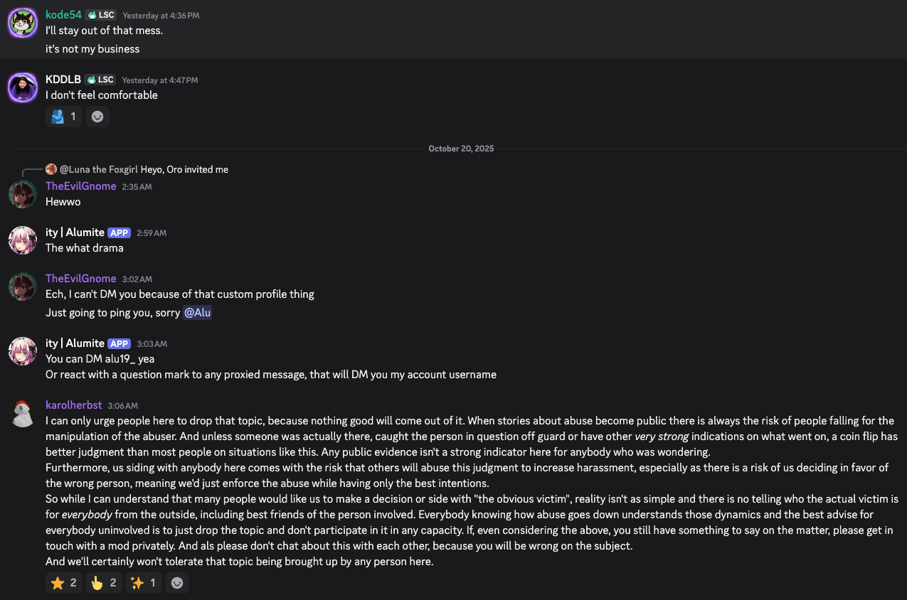 Attached: 3 images I have learned that Luna has joined the Freedesktop Discord. People expressed feeling unsafe, but the admin shut down discussion immediately. Luna has been passing around screenshots where an unidentified FDo CoC team member discusses banning me with her, and states that they have "a plan" [to deal with me]. I'm at my wit's end here. I have no idea how it's come to this. I feel like nobody in the Linux graphics/desktop community stood up for me as Luna manipulated and brainwashed people one by one. I will be removing myself from all FDo spaces entirely, including no longer contributing to any FDo-managed projects in any way. I'm sorry. I can't do this any more. Context: https://asahilina.net/luna-abuse
