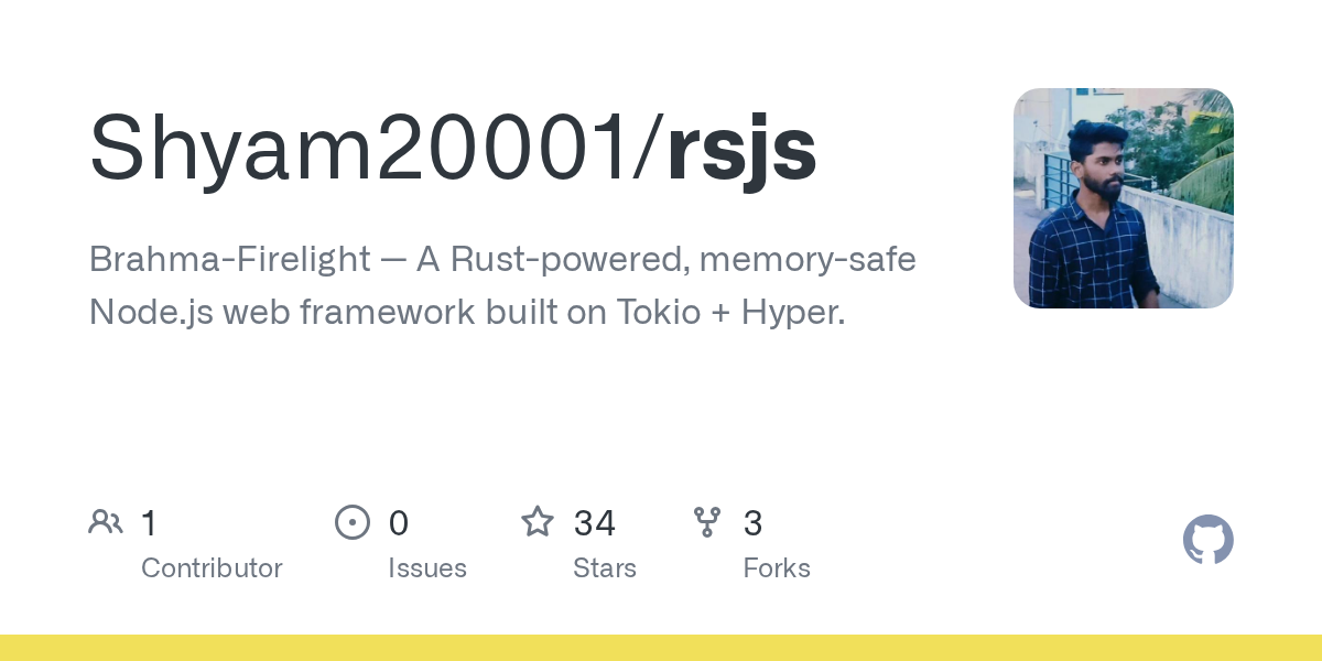 GitHub - Shyam20001/rsjs: Brahma-Firelight — A Rust-powered, memory-safe Node.js web framework built on Tokio + Hyper.