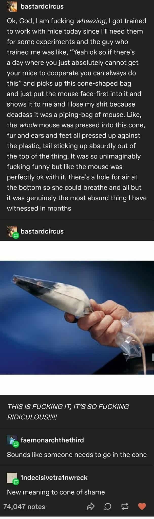 The last time I saw this meme, someone commented that these bags are made and used so that the mouse can be euthanized after an experiment. Supposedly this holds the mouse in place so that it can be “cleanly” decapitated.