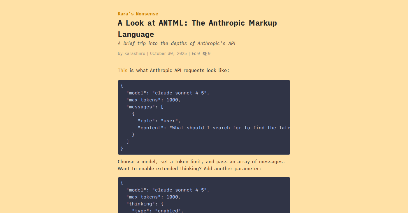 arrow-up13arrow-down1external-linkA Look at Antml: The Anthropic Markup Languagekarashiiro.leaflet.pubRSS BotMB to Hacker NewsEnglish · 6 hours agomessage-square0fedilinkfile-text