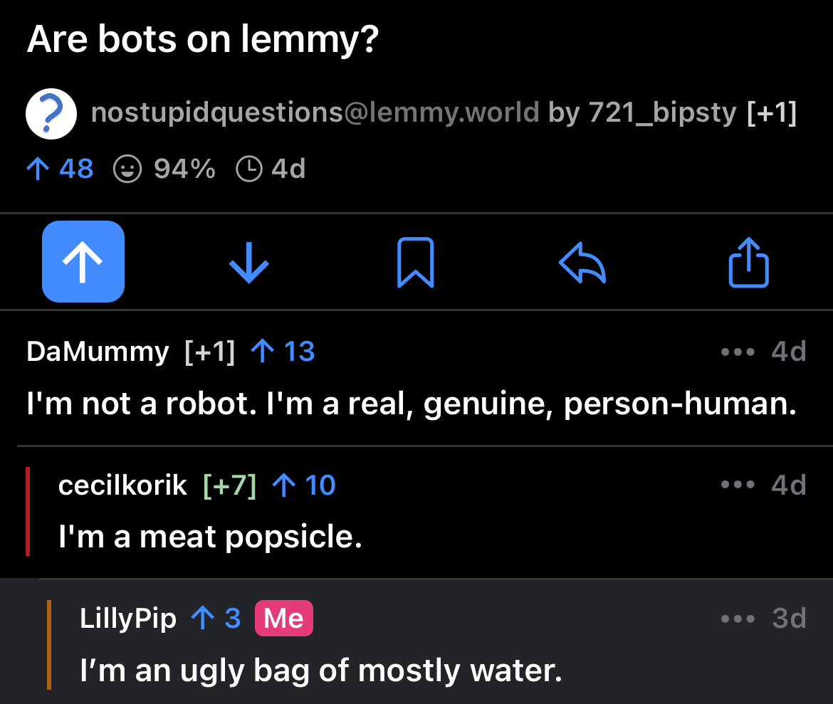 I just tried to upvote the upvote arrow in the picture, but it turned out that was actually the real upvote button and the one in the picture is up there (and doesn’t work). I would remove the accidental upvote but I’m scared I might hit the picture instead and I’ve already had enough embarrassment for one day.