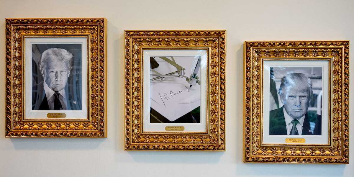The portraits of presidents as seen outside the Oval Office, except former President Biden, whose portrait is an autopen.