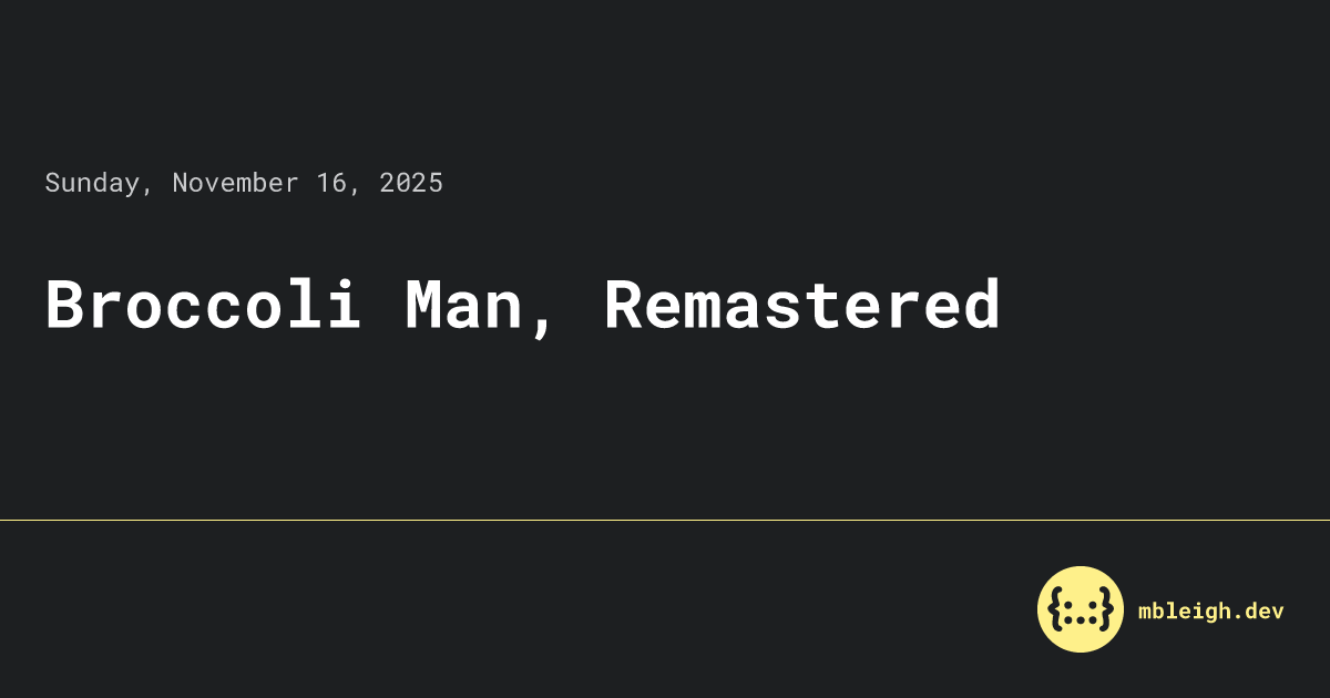 arrow-up1-1arrow-down1external-linkBroccoli Man, Remasteredmbleigh.devRSS BotMB to Hacker NewsEnglish · 7 hours agomessage-square1fedilinkfile-text