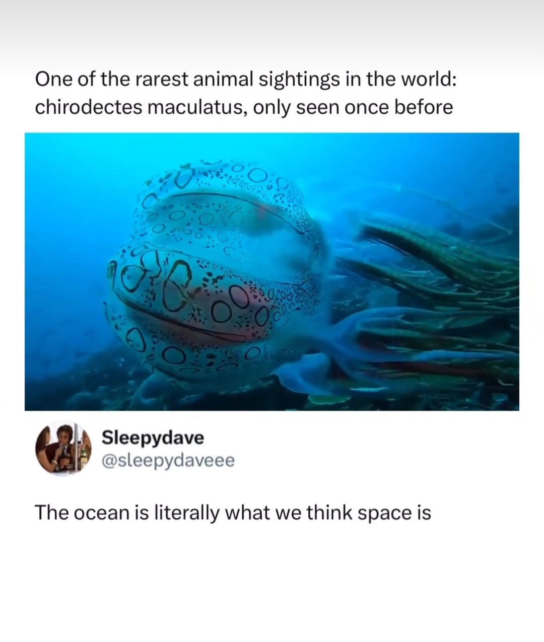 This reminds me of that. We’d assume that it’s more rare to find some unknown animals in the sea than it is to find some unknown animals in your suburban backyard. Or at least I would think that’s a natural way to think. But it’s really not that different. If you walk through your backyard, you might step on an animal that is rarer than the chirodectes maculatus.
