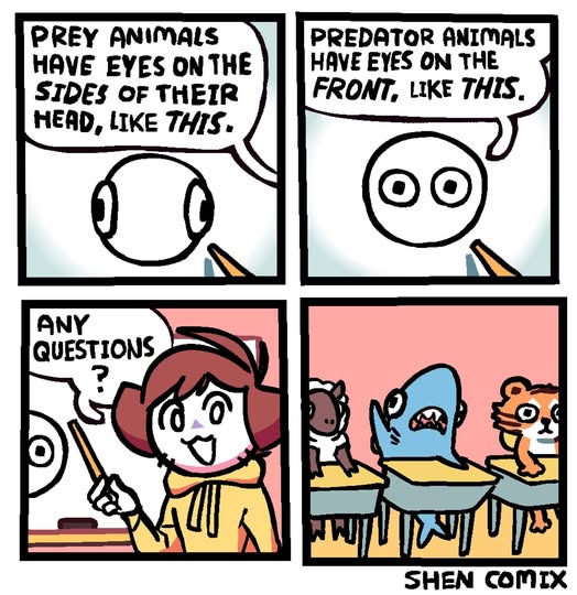 Maybe it doesn’t apply ocean animals. Like they would want to see both above and below for their environment, but I’d also think for predators it would be slightly more front facing