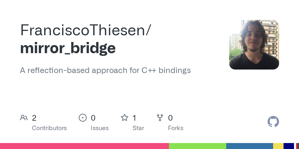 arrow-up11arrow-down1external-linkShow HN: Mirror_bridge – C++ Reflection powered Python binding generationgithub.comRSS BotMB to Hacker NewsEnglish · 3 hours agomessage-square0fedilinkfile-text