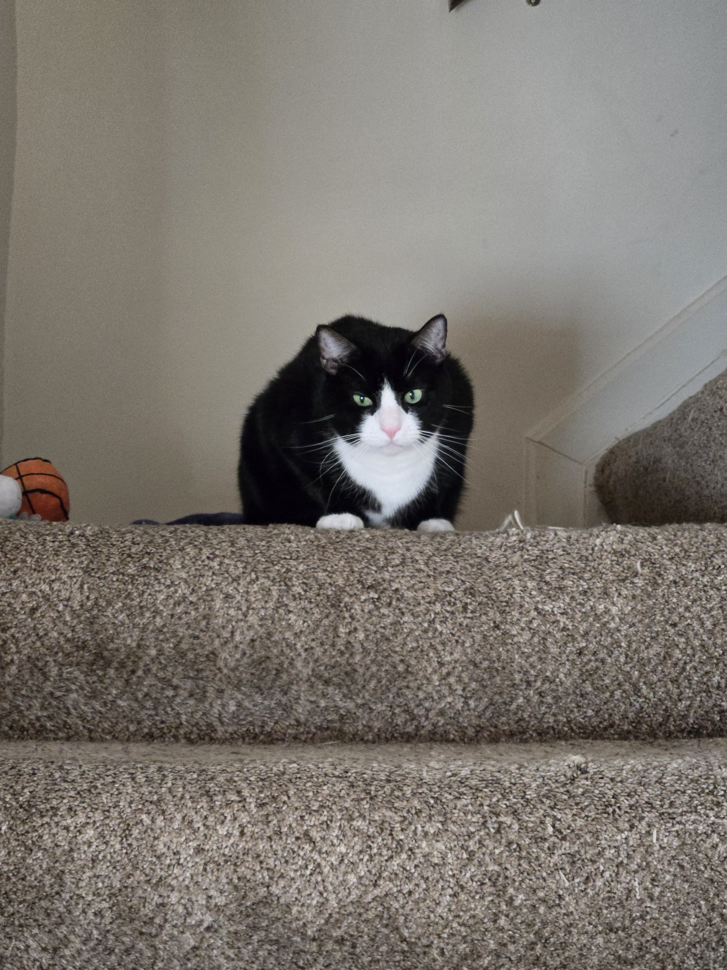 Then, a few weeks ago, there was a new wrinkle. Now, while I’m pouring Inky’s food, he’ll almost always be on the landing in the picture, meowing like crazy at me. Then I start heading for the bedroom and he stays ahead of me, but constantly looking back and meowing more, until I put the food down. I, of course, can’t resist meowing back at him the whole time.