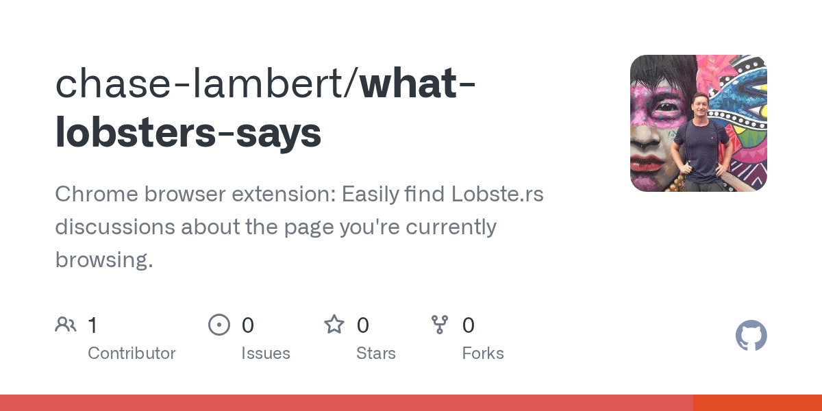 I’ve used a “What HN Says” browser extension (<a href=“https://github.com/pinoceniccola/what-hn-says-webext” rel=“ugc”>https://github.com/pinoceniccola/what-hn-says-webext</a>) for years and wanted a version for Lobste.rs so I built this small extension using ClojureScript (so you will need a Java runtime installed to build it as of now). It basically let’s you see if the current web page you are on has been discussed on Lobste.rs. It’s not the cleanest cljs as I just did some heavy js interop and used no deps besides shadow-cljs. It was just for personal use so it’s Chrome only for now and I probably won’t add others unless I finally change browsers or you folks actually use this thing and want it but I just figured I would share in case anyone else finds it useful. Comments