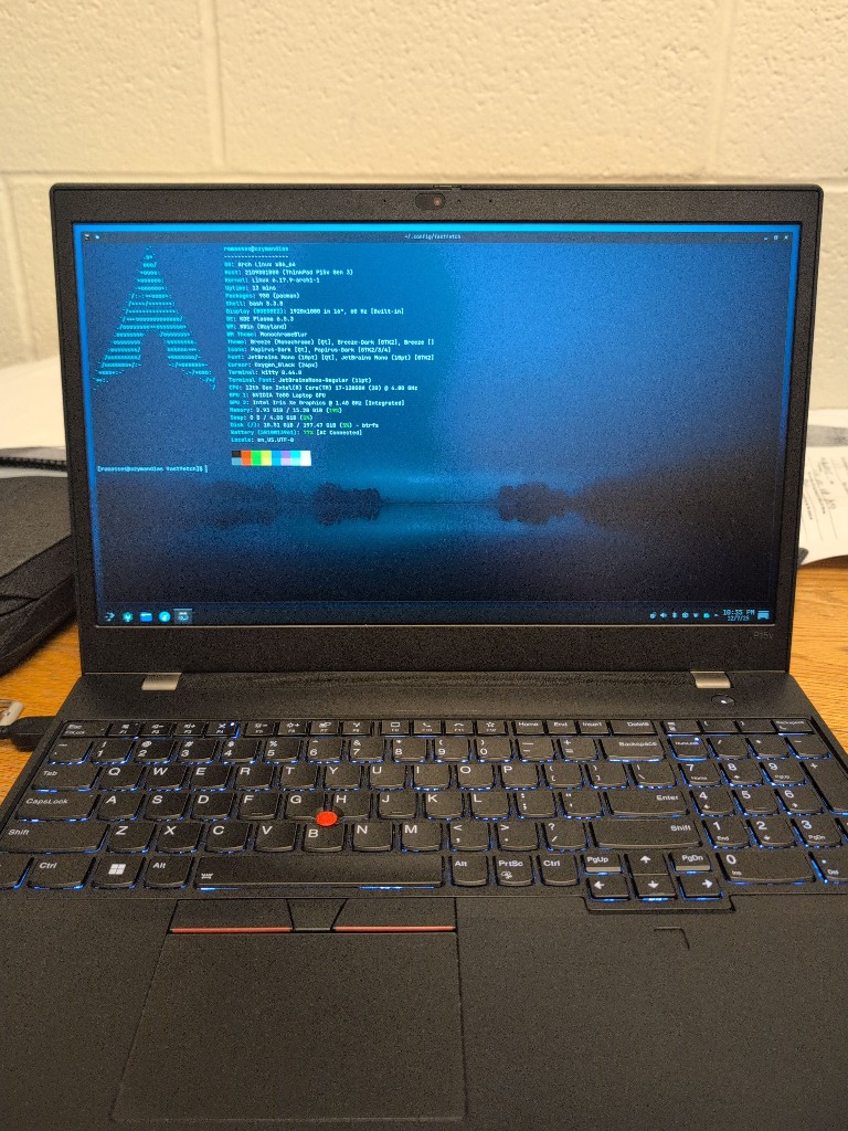 Thinkpad P15v gen 3 running arch. I played around with fedora a bit but it was boring. I got a working gentoo install running but that was too complicated, so I settled on arch.