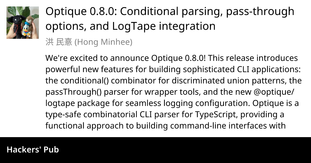 We're excited to announce Optique 0.8.0! This release introduces powerful new features for building sophisticated CLI applications: the conditional() combinator for discriminated union patterns, the passThrough() parser for wrapper tools, and the new @optique/logtape package for seamless logging configuration. Optique is a type-safe combinatorial CLI parser for TypeScript, providing a functional approach to building command-line interfaces with composable parsers and full type inference. New conditional parsing with conditional() Ever needed to enable different sets of options based on a discriminator value? The new conditional() combinator makes this pattern first-class. It creates discriminated unions where certain options only become valid when a specific discriminator value is selected. import { conditional, object } from "@optique/core/constructs";import { option } from "@optique/core/primitives";import { choice, string } from "@optique/core/valueparser";const parser = conditional( option("--reporter", choice(["console", "junit", "html"])), { console: object({}), junit: object({ outputFile: option("--output-file", string()) }), html: object({ outputFile: option("--output-file", string()) }), });// Result type: ["console", {}] | ["junit", { outputFile: string }] | ... Key features: Explicit discriminator option determines which branch is selected Tuple result [discriminator, branchValue] for clear type narrowing Optional default branch for when discriminator is not provided Clear error messages indicating which options are required for each discriminator value The conditional() parser provides a more structured alternative to or() for discriminated union patterns. Use it when you have an explicit discriminator option that determines which set of options is valid. See the conditional() documentation for more details and examples. Pass-through options with passThrough() Building wrapper CLI tools that need to forward unrecognized options to an underlying tool? The new passThrough() parser enables legitimate wrapper/proxy patterns by capturing unknown options without validation errors. import { object } from "@optique/core/constructs";import { option, passThrough } from "@optique/core/primitives";const parser = object({ debug: option("--debug"), extra: passThrough(),});// mycli --debug --foo=bar --baz=qux// → { debug: true, extra: ["--foo=bar", "--baz=qux"] } Key features: Three capture formats: "equalsOnly" (default, safest), "nextToken" (captures --opt val pairs), and "greedy" (captures all remaining tokens) Lowest priority (−10) ensures explicit parsers always match first Respects -- options terminator in "equalsOnly" and "nextToken" modes Works seamlessly with object(), subcommands, and other combinators This feature is designed for building Docker-like CLIs, build tool wrappers, or any tool that proxies commands to another process. See the passThrough() documentation for usage patterns and best practices. LogTape logging integration The new @optique/logtape package provides seamless integration with LogTape, enabling you to configure logging through command-line arguments with various parsing strategies. # Denodeno add --jsr @optique/logtape @logtape/logtape# npmnpm add @optique/logtape @logtape/logtape Quick start with the loggingOptions() preset: import { loggingOptions, createLoggingConfig } from "@optique/logtape";import { object } from "@optique/core/constructs";import { parse } from "@optique/core/parser";import { configure } from "@logtape/logtape";const parser = object({ logging: loggingOptions({ level: "verbosity" }),});const args = ["-vv", "--log-output=-"];const result = parse(parser, args);if (result.success) { const config = await createLoggingConfig(result.value.logging); await configure(config);} The package offers multiple approaches to control log verbosity: verbosity() parser: The classic -v/-vv/-vvv pattern where each flag increases verbosity (no flags → "warning", -v → "info", -vv → "debug", -vvv → "trace") debug() parser: Simple --debug/-d flag that toggles between normal and debug levels logLevel() value parser: Explicit --log-level=debug option for direct level selection logOutput() parser: Log output destination with - for console or file path for file output See the LogTape integration documentation for complete examples and configuration options. Bug fix: negative integers now accepted Fixed an issue where the integer() value parser rejected negative integers when using type: "number". The regex pattern has been updated from /^\d+$/ to /^-?\d+$/ to correctly handle values like -42. Note that type: "bigint" already accepted negative integers, so this change brings consistency between the two types. Installation # Denodeno add jsr:@optique/core# npmnpm add @optique/core# pnpmpnpm add @optique/core# Yarnyarn add @optique/core# Bunbun add @optique/core For the LogTape integration: # Denodeno add --jsr @optique/logtape @logtape/logtape# npmnpm add @optique/logtape @logtape/logtape# pnpmpnpm add @optique/logtape @logtape/logtape# Yarnyarn add @optique/logtape @logtape/logtape# Bunbun add @optique/logtape @logtape/logtape Looking forward Optique 0.8.0 continues our focus on making CLI development more expressive and type-safe. The conditional() combinator brings discriminated union patterns to the forefront, passThrough() enables new wrapper tool use cases, and the LogTape integration makes logging configuration a breeze. As always, all new features maintain full backward compatibility—your existing parsers continue to work unchanged. We're grateful to the community for feedback and suggestions. If you have ideas for future improvements or encounter any issues, please let us know through GitHub Issues. For more information about Optique and its features, visit the documentation or check out the full changelog.