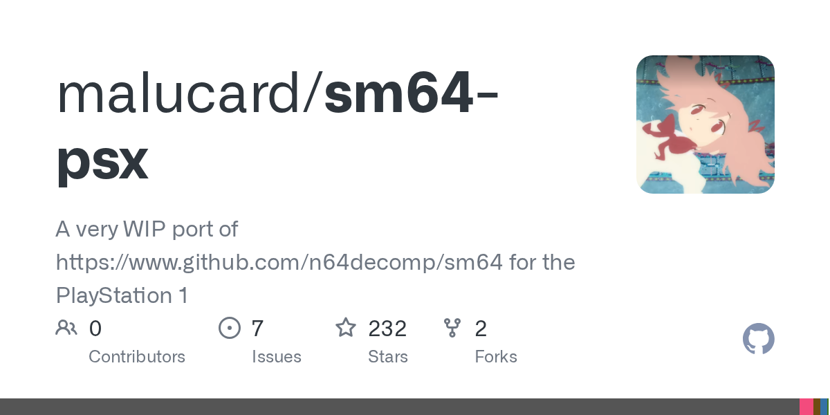 arrow-up18arrow-down1external-linkSuper Mario 64 for the PS1github.comRSS BotMB to Hacker NewsEnglish · 2 hours agomessage-square1fedilinkfile-text