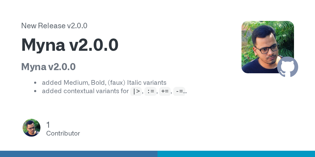 Myna now has support for different weights and style, including Regular, Medium, Bold, and (faux) Italic. It also features a few contextual variants to make pipes in Gleam and variable assignment in Go look much more aligned. When I submitted it last time, judging from the title, a few folks mistook it to be designed for APL. In Myna v2.0, I’ve tried to incorporate quite a few glyphs from APL to make symbolic programming fun. Please feel free to report missing and misaligned glyphs. Comments