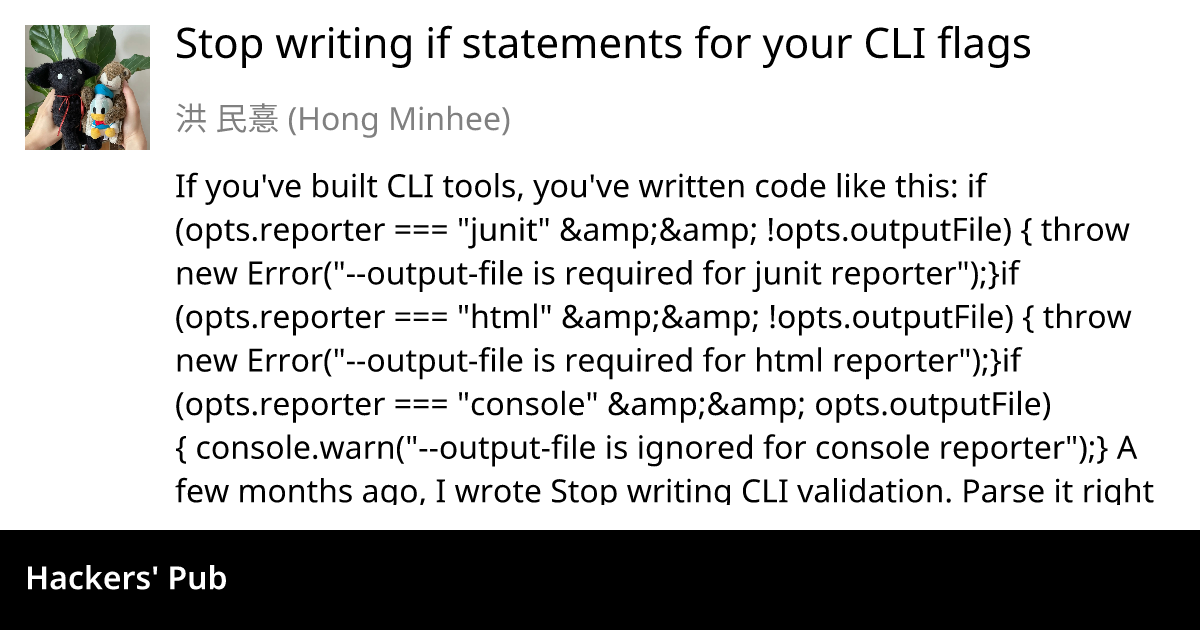 A few months ago, I wrote Stop writing CLI validation. Parse it right the first time. about parsing individual option values correctly. But it didn't cover the relationships between options.