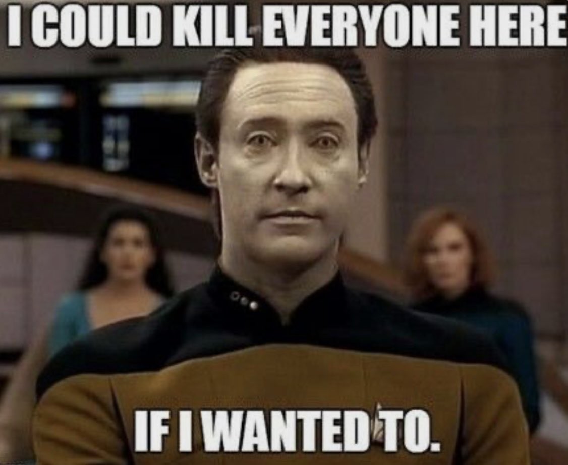 In my opinion it makes Data’s character all the better, because all those times he’s being treated like a machine, when his very humanity is on trial, he could flip and kill everyone and take the ship and do whatever he wants, but he doesn’t - because he’s Data, and that’s not the kind of person he is.