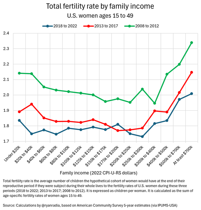 Lower end have more because because of limited access to contraception (which costs money) among other things. But yeah, the whole “being broke” excuse is bullshit. Poor people have more kids and ever people that are doing great don’t have that many kids. Theoretically you could hit replacement rate by making everyone a millionaire but I don’t know how that could work.