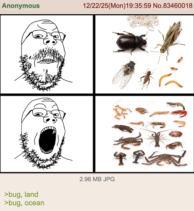 Dawg. Insects broke away from the arthropods in the ocean and came on land in the fucking Devonian period. That makes crabs and insects about as related as you and a lobe-finned fish.