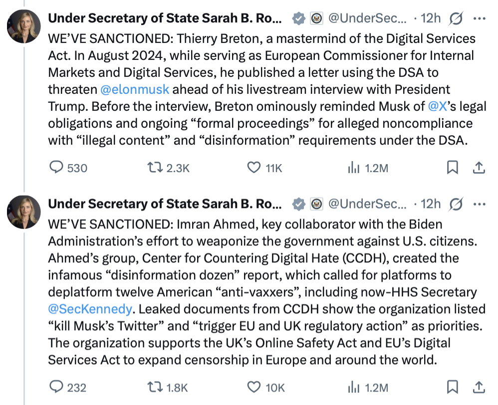Attached: 2 images The US is sanctioning Thierry Breton and Trusted Flaggers that are critical for the application and enforcement of the #DSA. Full solidarity with the unjustly sanctioned individuals. As Breton called out, 90% of the European Parliament and all 27 Member States unanimously voted the DSA. This bullying into vassalisation of Europe is unacceptable.