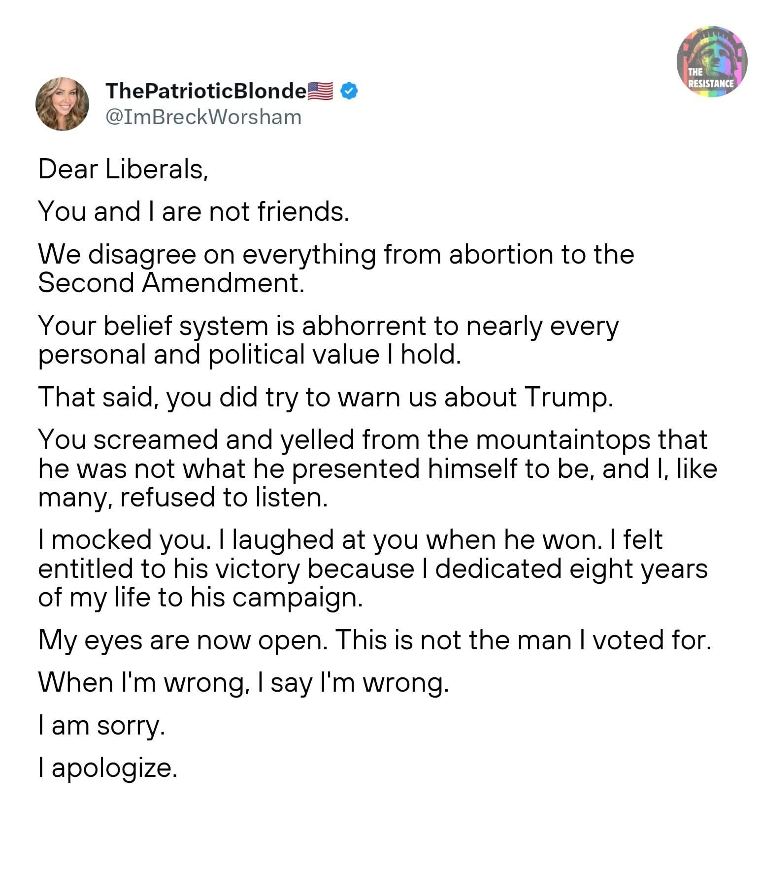 FreshParsnip@lemmy.ca to Leopards Ate My Face@lemmy.worldEnglish · edit-23 days agoTrump supporter apologizes for not heeding the warnings, still a Republicanlemmy.caimagemessage-square272fedilinkarrow-up1757arrow-down140