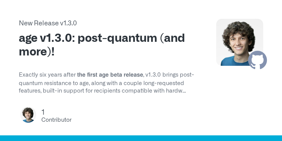 arrow-up11arrow-down1external-linkRelease age v1.3.0: post-quantum (and more)github.comRSS BotMB to Lobste.rsEnglish · 2 hours agomessage-square0fedilinkfile-text