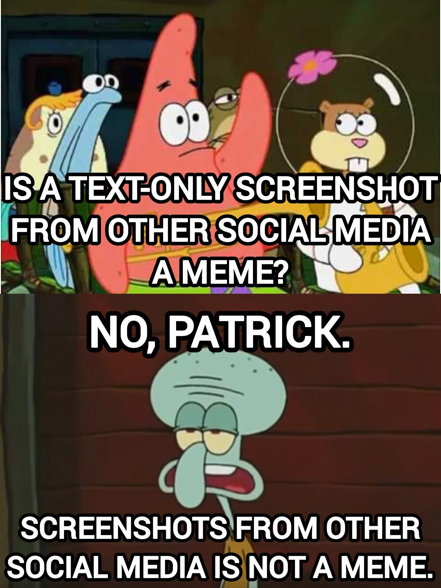 CyberEgg@discuss.tchncs.de to memes@lemmy.world · 3 days agoI'm here for memes, not snappy Xitter, 4Chan, reddit or similarly sourced screenshots of textsdiscuss.tchncs.deimagemessage-square173fedilinkarrow-up1876arrow-down172