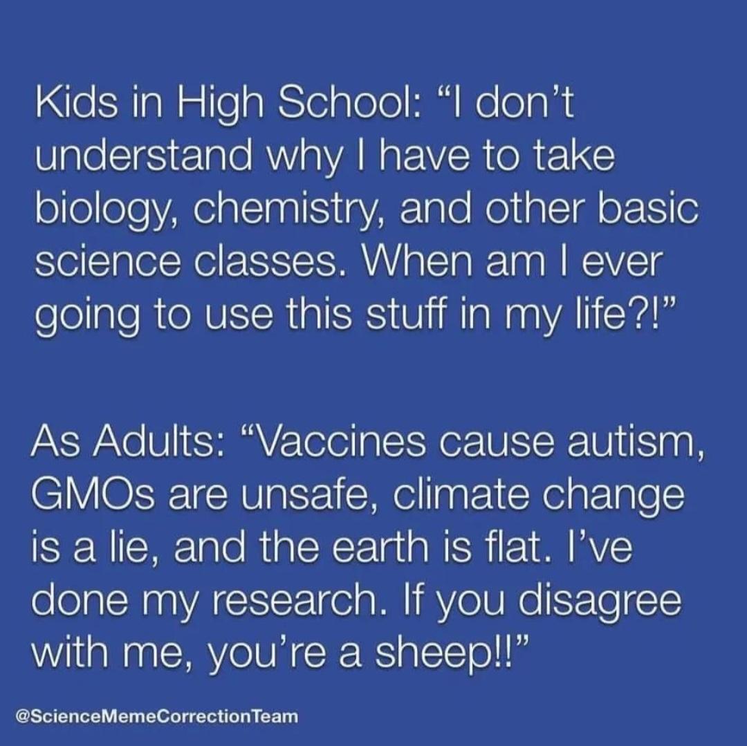 If we want children to learn these things, we should teach them these things directly, instead of relying on science classes. I’m not saying we should get rid of science classes, but the people who are saying these stupid things did actually take science classes in school.