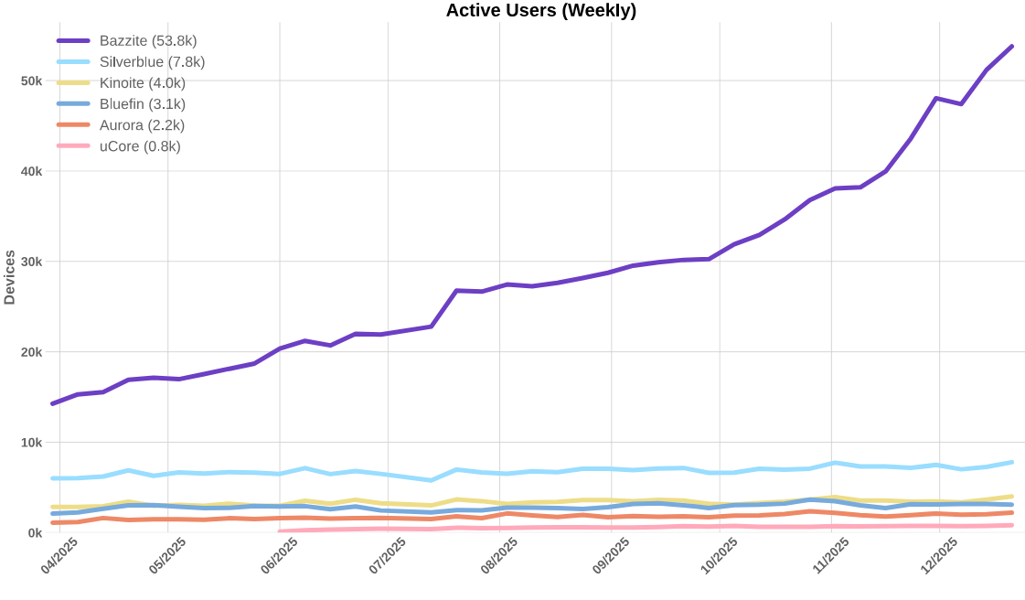 Bazzle (a Fedora Linux Atomic Image) has seen a massive jolt in growth over the holiday season, surpassing 50k active users. The Fedora Atomic image has gained 38.8k users total in 2025 since it began counting in April 🥳the seemingly endless random named things