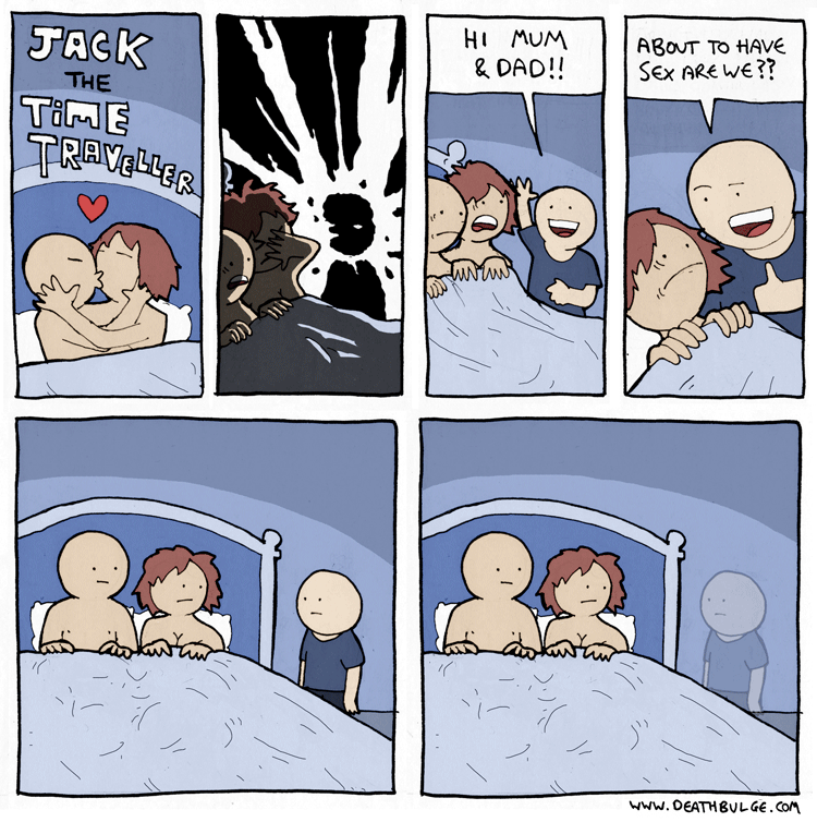 Strange choice to make the time traveler a young child and eager to talk about their parents having sex.