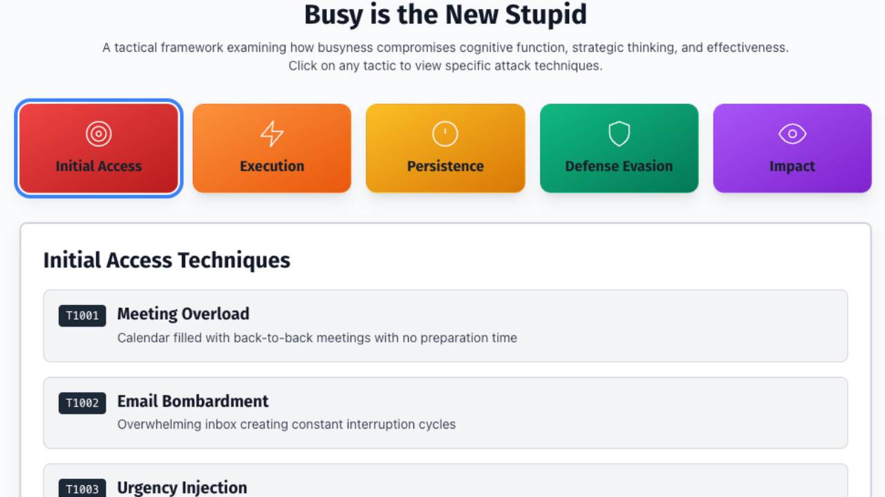 "Busy is the New Stupid" is an interactive dashboard applying the MITRE ATT&CK framework to productivity. It treats cognitive drains like meeting overload as threats across phases like Initial Access and Impact, offering tactical defense strategies to combat busyness and restore strategic focus.