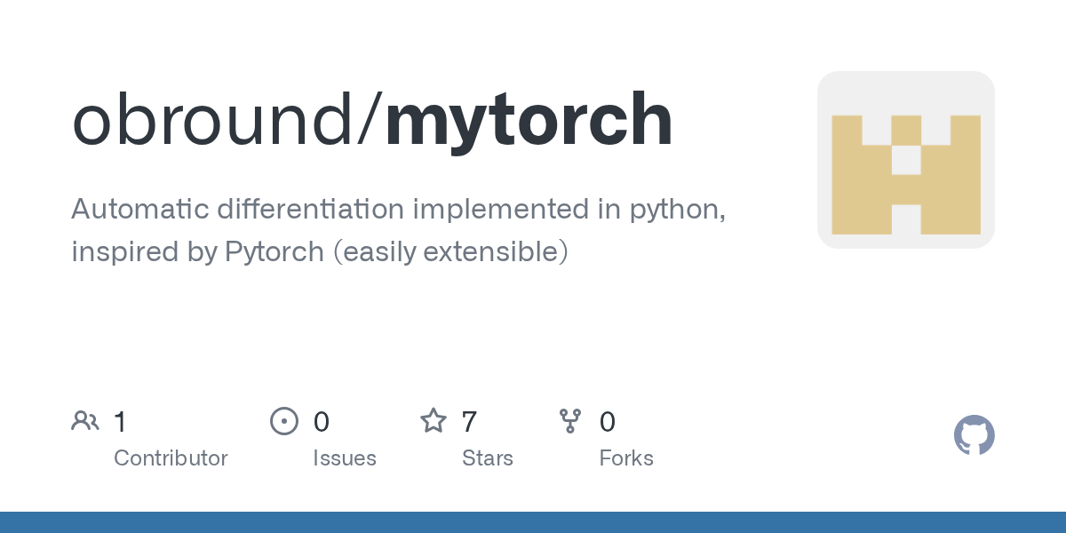 arrow-up13arrow-down1external-linkMyTorch – Minimalist autograd in 450 lines of Pythongithub.comRSS BotMB to Hacker NewsEnglish · 1 day agomessage-square0fedilinkfile-text