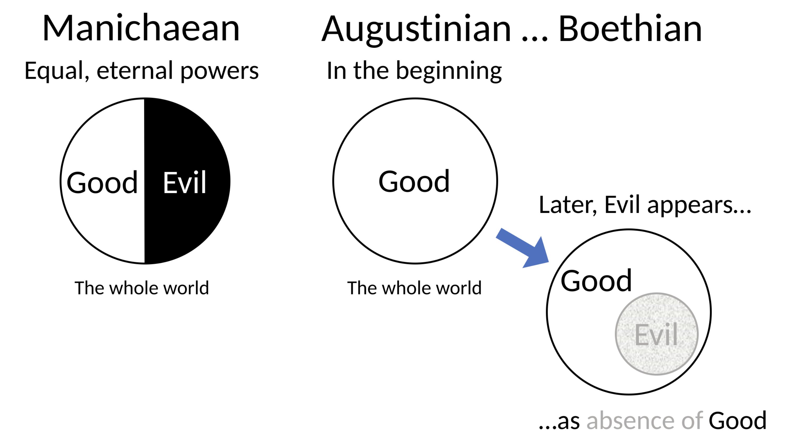 I find that the second model in your image is more accurate from a utilitarian perspective. At the most basic level, I think the origin of goodness is in pleasure (/happiness/whatever). Evil is the opposite: someone taking away your pleasure. Therefore goodness exists first, and then evil emerges as the absence of good.