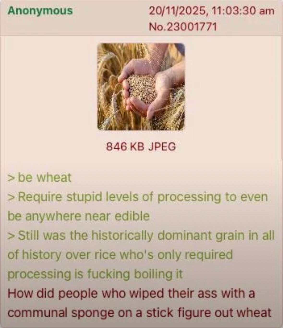 Sine_Fine_Belli@lemmy.world to Science Memes@mander.xyzEnglish · 2 days agoAnon thinks about wheatsh.itjust.worksimagemessage-square56fedilinkarrow-up1299arrow-down118file-text