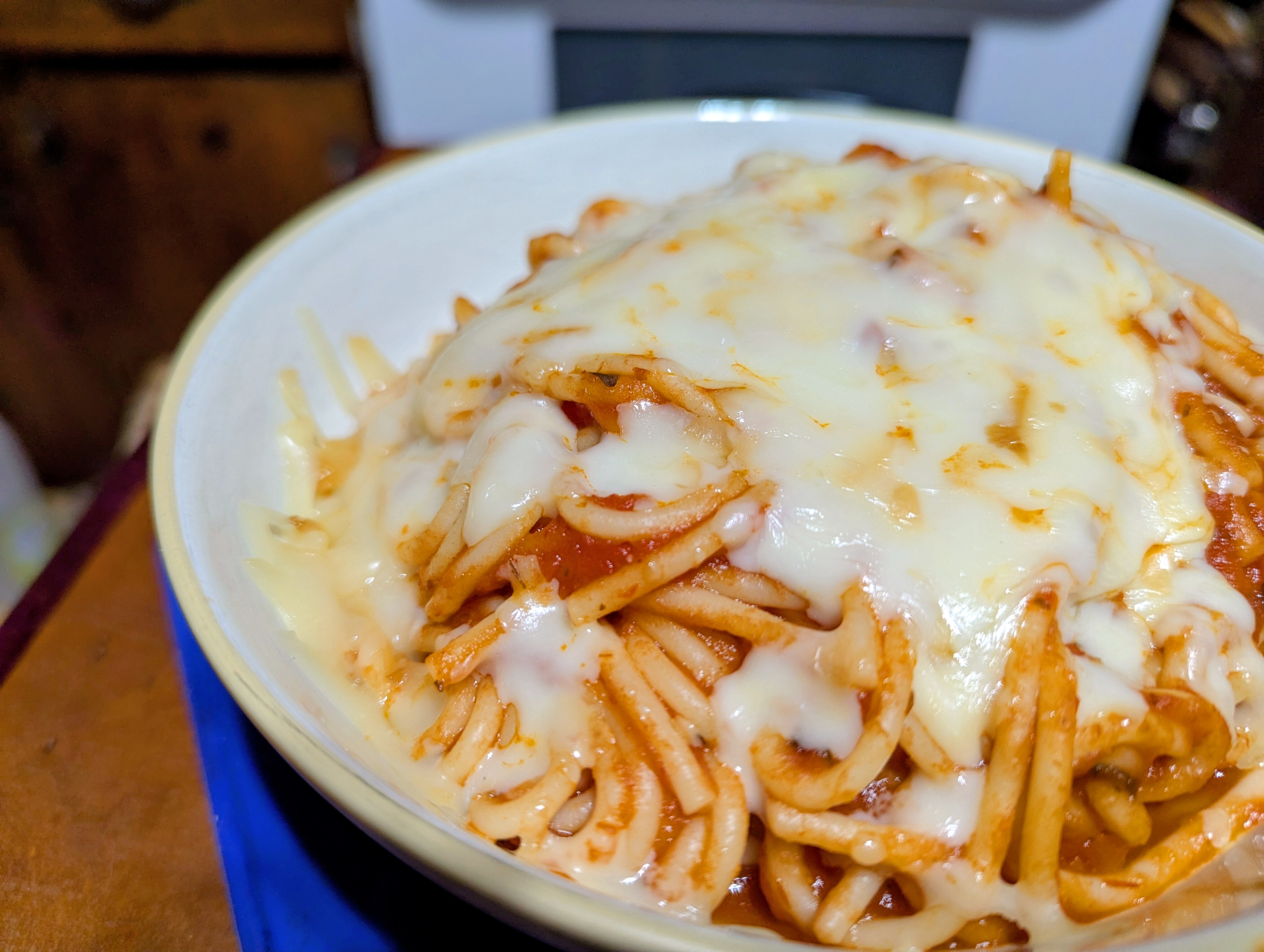 I used jarred sauce because after a day of repairing floor joists I was in too much pain to make my own from a can of crushed tomatoes. And I used brass cut die spaghetti because it was already open so this is a bit pricier than normal for what should be a cheaper meal.