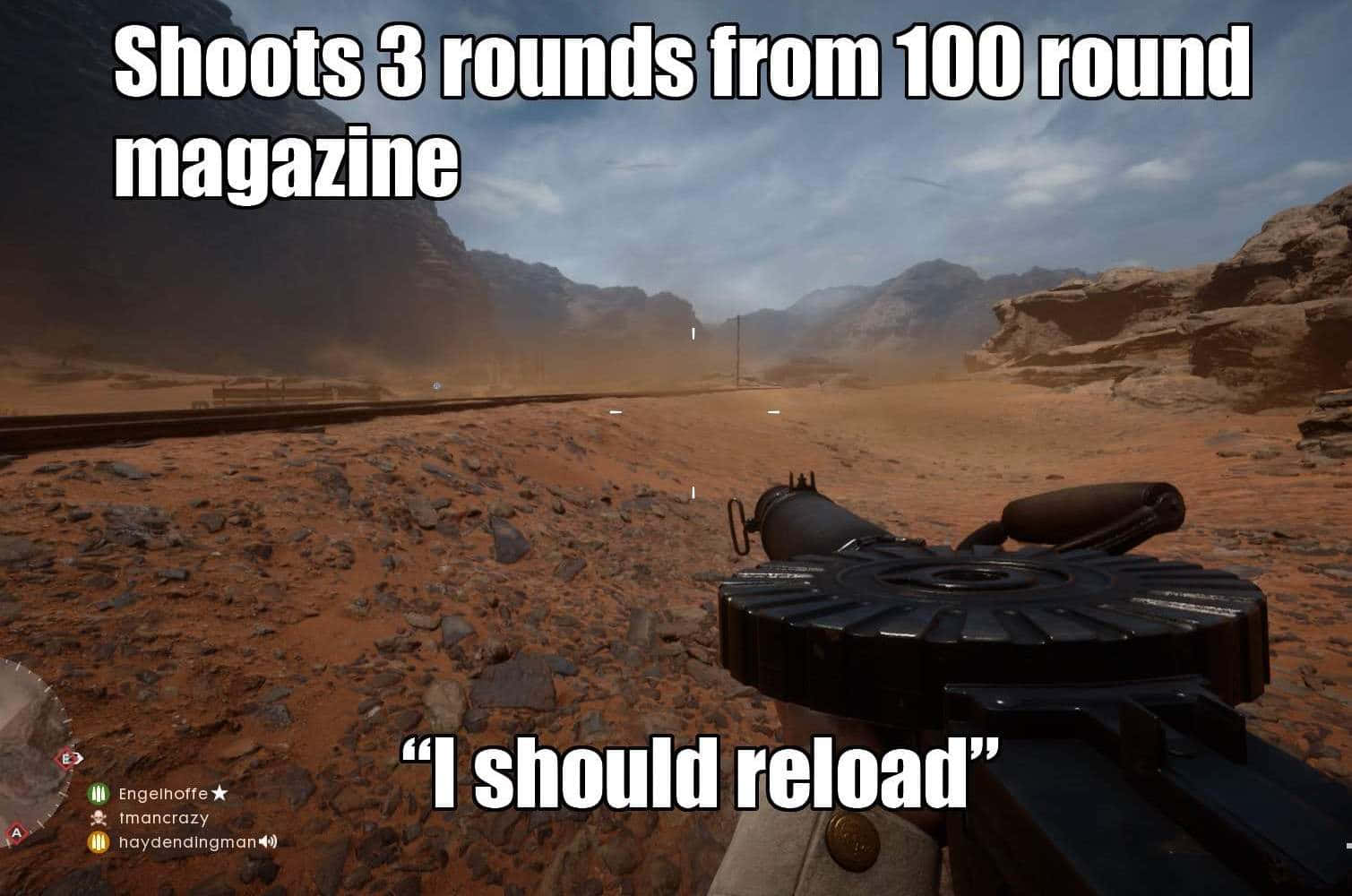 … Takes cover and starts reloading, only to have a medic jumping like a bunny appear from the smoke and headshot you 3 times from the hip.
