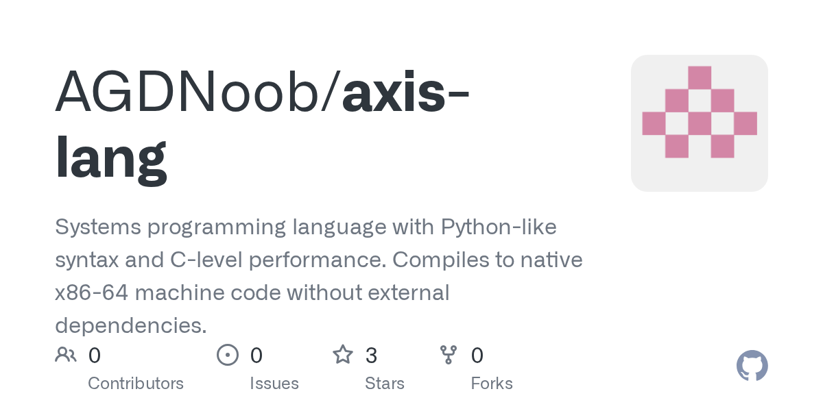 arrow-up11arrow-down1external-linkShow HN: Axis – A systems programming language with Python syntaxgithub.comRSS BotMB to Hacker NewsEnglish · 4 hours agomessage-square0fedilinkfile-text