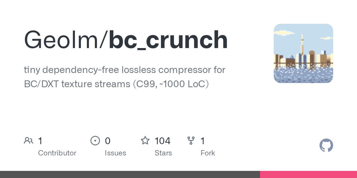 arrow-up11arrow-down1external-linkbc_crunch: tiny lossless compressor for BC/DXT texture streamsgithub.comRSS BotMB to Lobste.rsEnglish · 23 hours agomessage-square0fedilinkfile-text